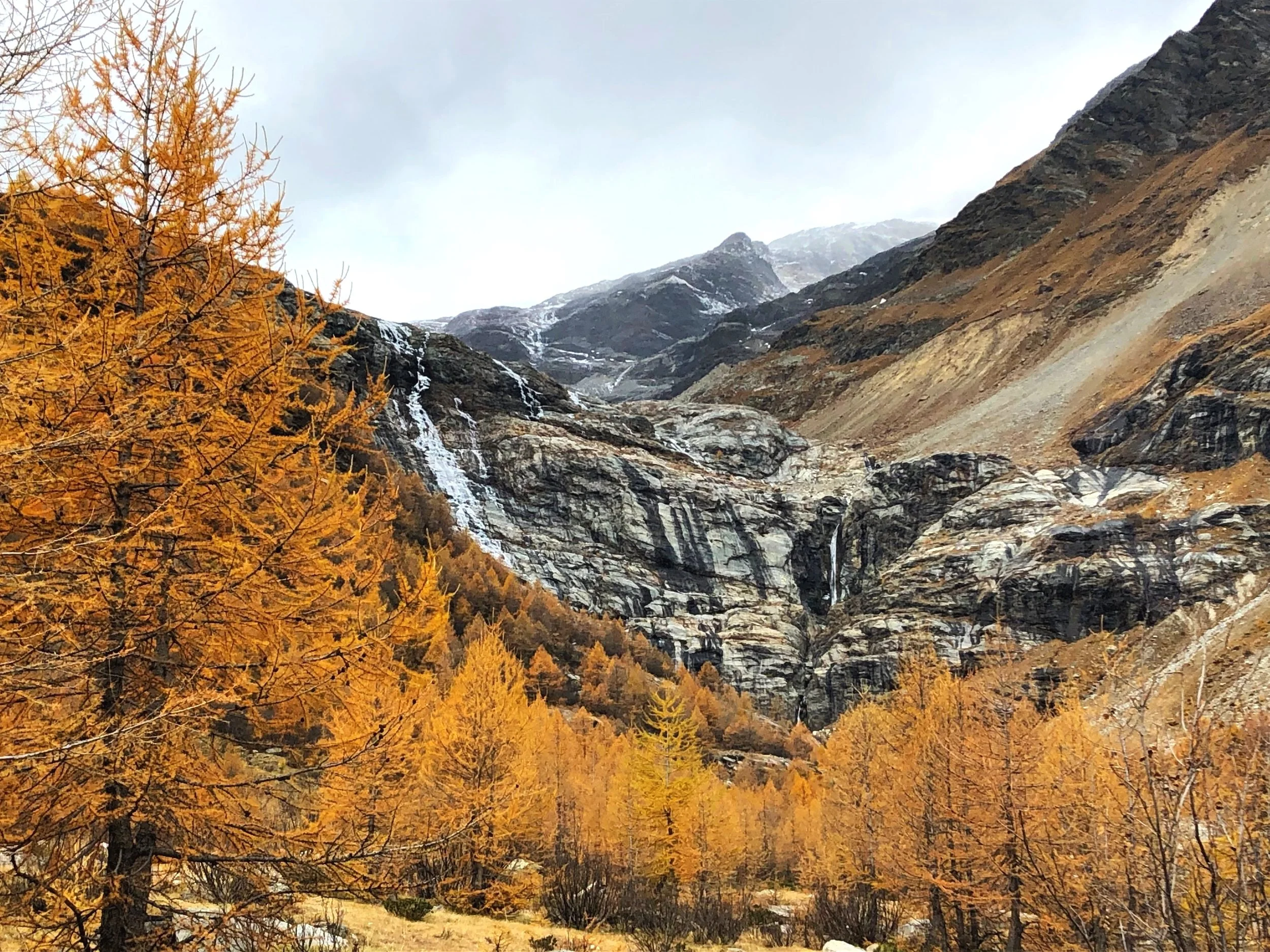 After gazing at the post-impressionistic lake, we began our ascent towards our goal, Lagh da Caralin. The trail started off through the iconic golden larches, dozens of frozen waterfalls dangled in the distance.