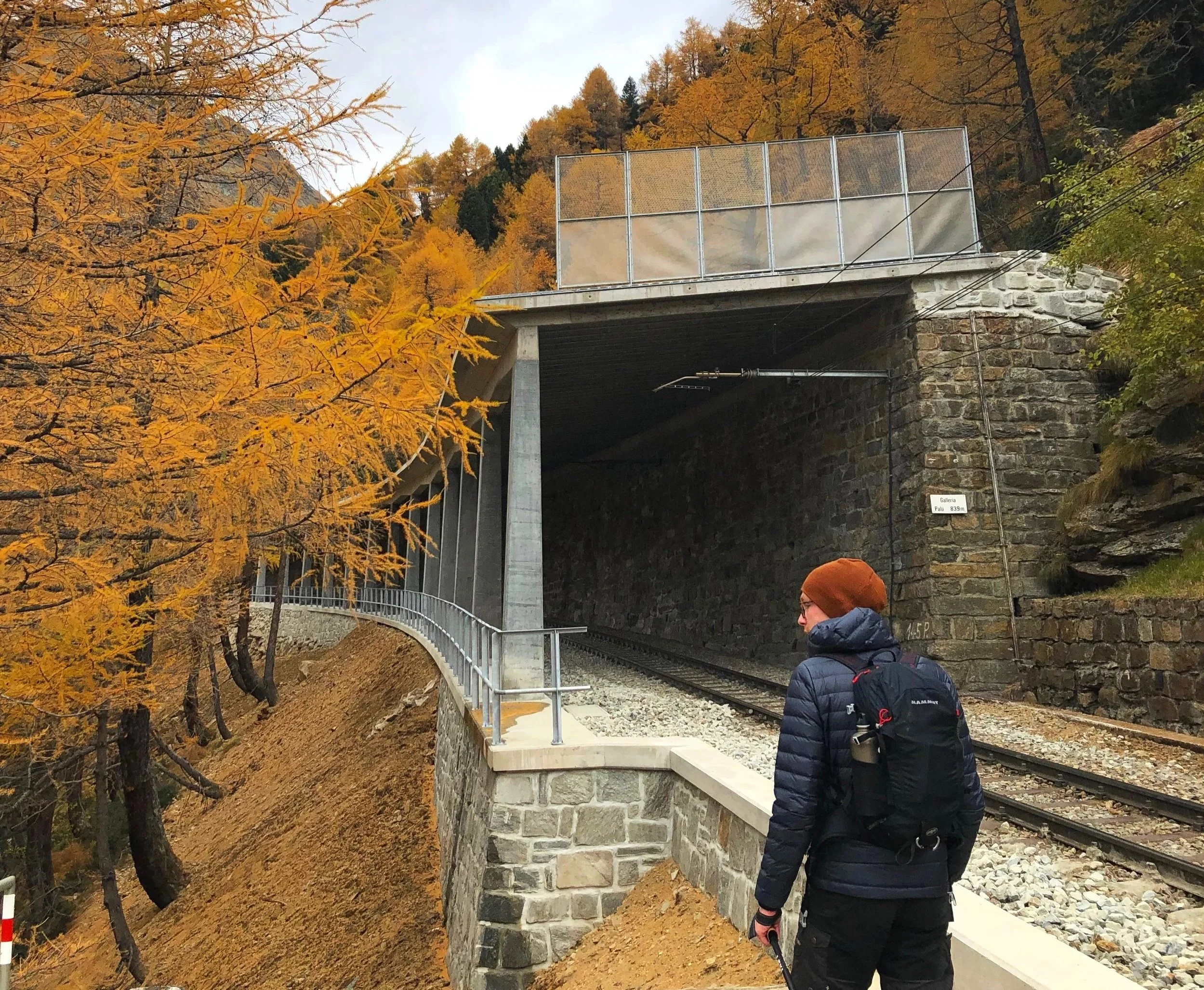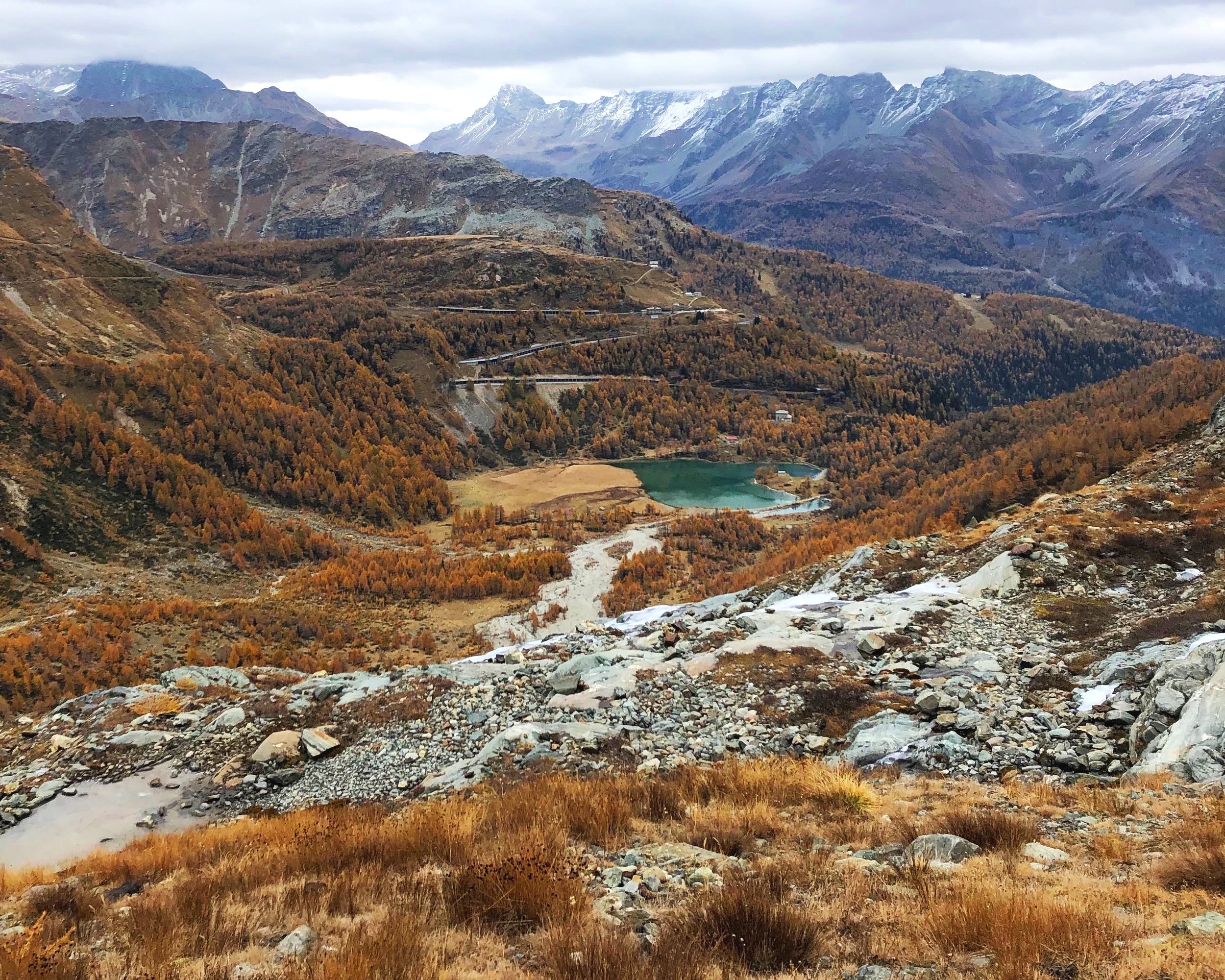 The trail starts at the Alp Grüm stop, right before the train descends the mountain towards the Mediterranean valleys of Italy. First, the trail leads across the zigzag of train tracks down the mountain towards the turquoise lake, Lago Palü.