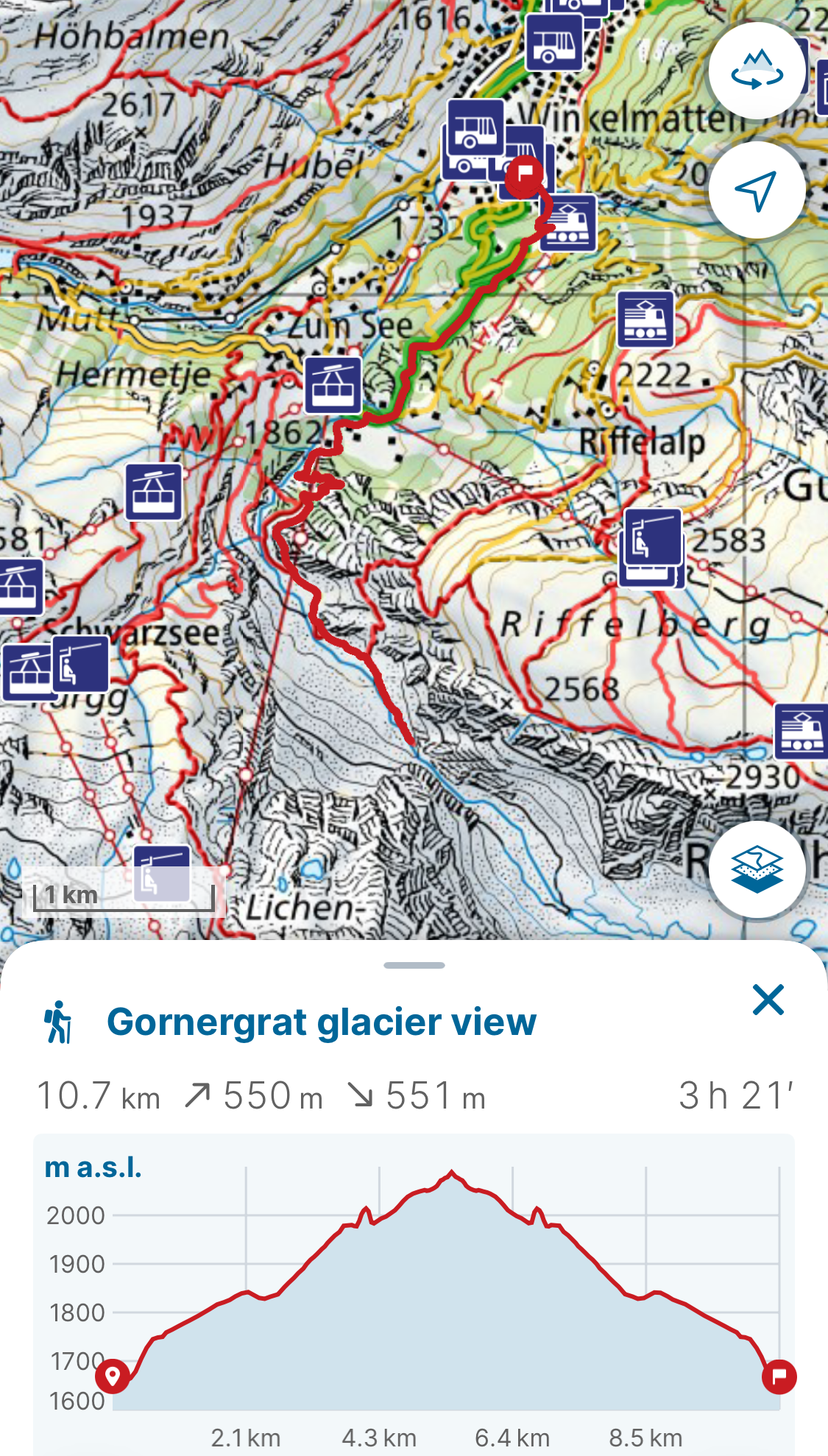 This first hike is easily done from the town of Zermatt and offers a decently physical hike with an elevation increase and decrease of around 550 meters.
