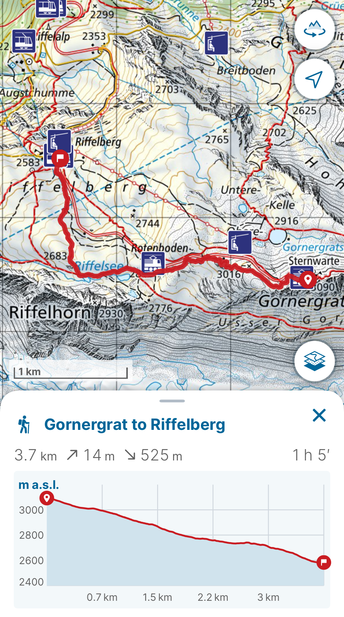 There are two different starting places to go to view the Gornergrat glacier; the first originates in Zermatt and the other in Gornergrat station at the top of the Gornergrat Railway. The first is a there and back hike to the glacier outlook where as the other is a point to point from the top of the railway to a lower station.