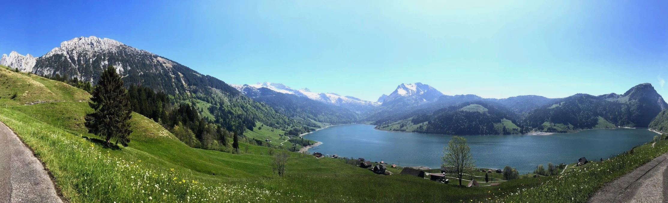 The second hike is calm and is perfect for any season. Most of the hike is along the road, but just after half way there is long portion on a trail that is not maintained in the winter. Therefore, waterproof boots and poles would be recommended. The first time I did it in the snow, it was February and my friend and I only had light hiking shoes. The first half of the lake was full of sun and snowless, but the side with the trail portion was in the shade with dense snow fields covering the entire hillside all the way to the edge of the lake. During the summer, the path is full of life with people enjoying the sun rays and lakeside view. Towards the end of the round, there is a lovely waterfall that is a splendid way to finish the journey. The path circles the lake and can completed at either the Innerthal, Post or Innerthal, Staumauer stop, depending on the timing.
