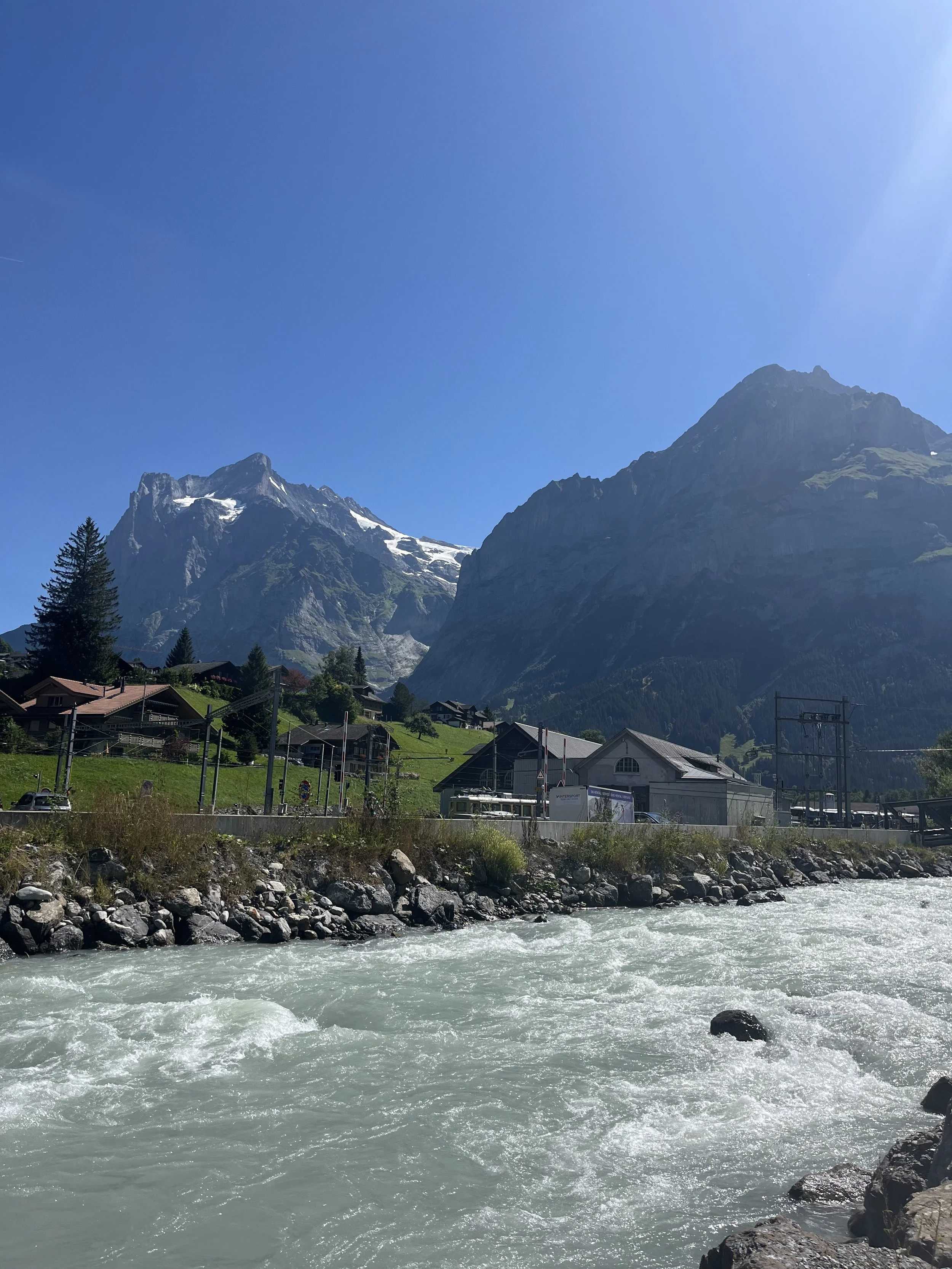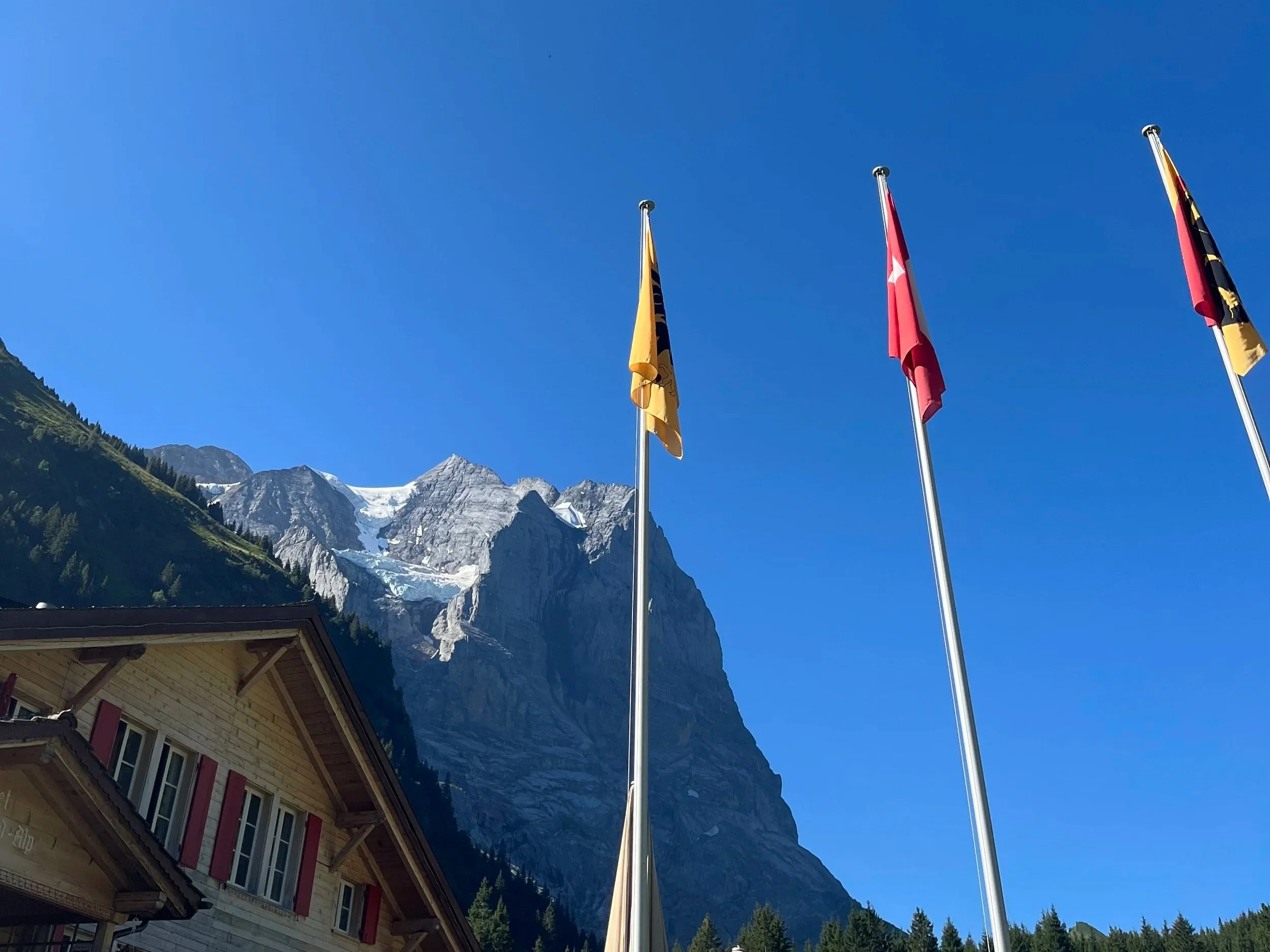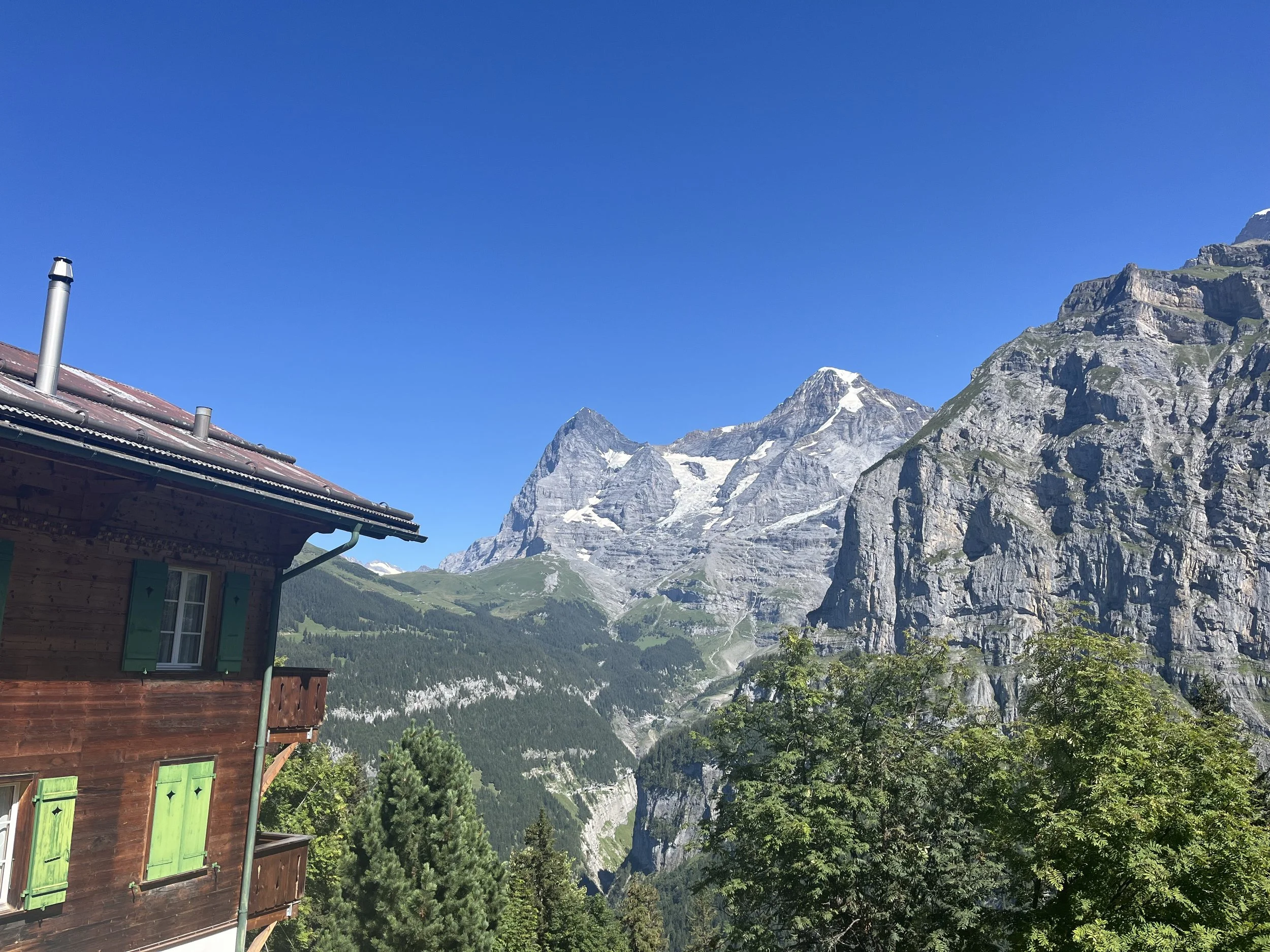The morning started off very relaxed with the delivery of the fresh bread and gipfelis. After saying goodbye to my new friends, I went to Coop and get some supplies for the next couple of days. The next part of the route was right along a bus line to Schwarzwaldalp. At the top there was connecting bus down to Grindelwald. Around Schwarzwaldalp there was a lovely view from the base of Wetterhorn as I waited for the connecting bus, which I was glad I did because the trail ran along the road and there were a couple of different biking races going on at the time. One on the road for race bikes and one on the trails for mountain bikes. It felt good to avoid all the bikers - however, I would soon learn in Grindelwald the races would continue from there again following along the trail. Grindelwald felt very overwhelming with the heat coming off the pavement and the tourists everywhere. I started to continue the trail to Wengen.