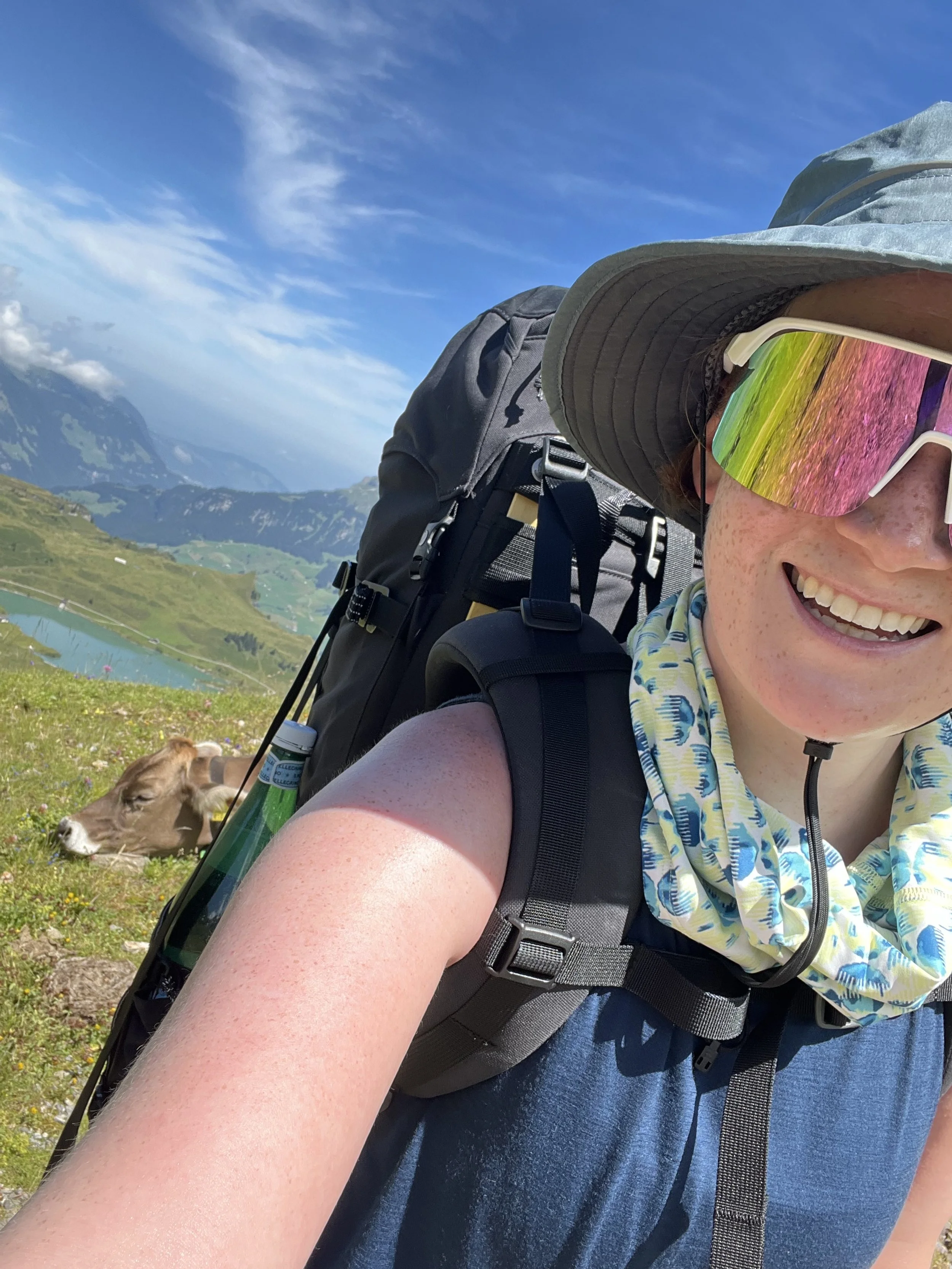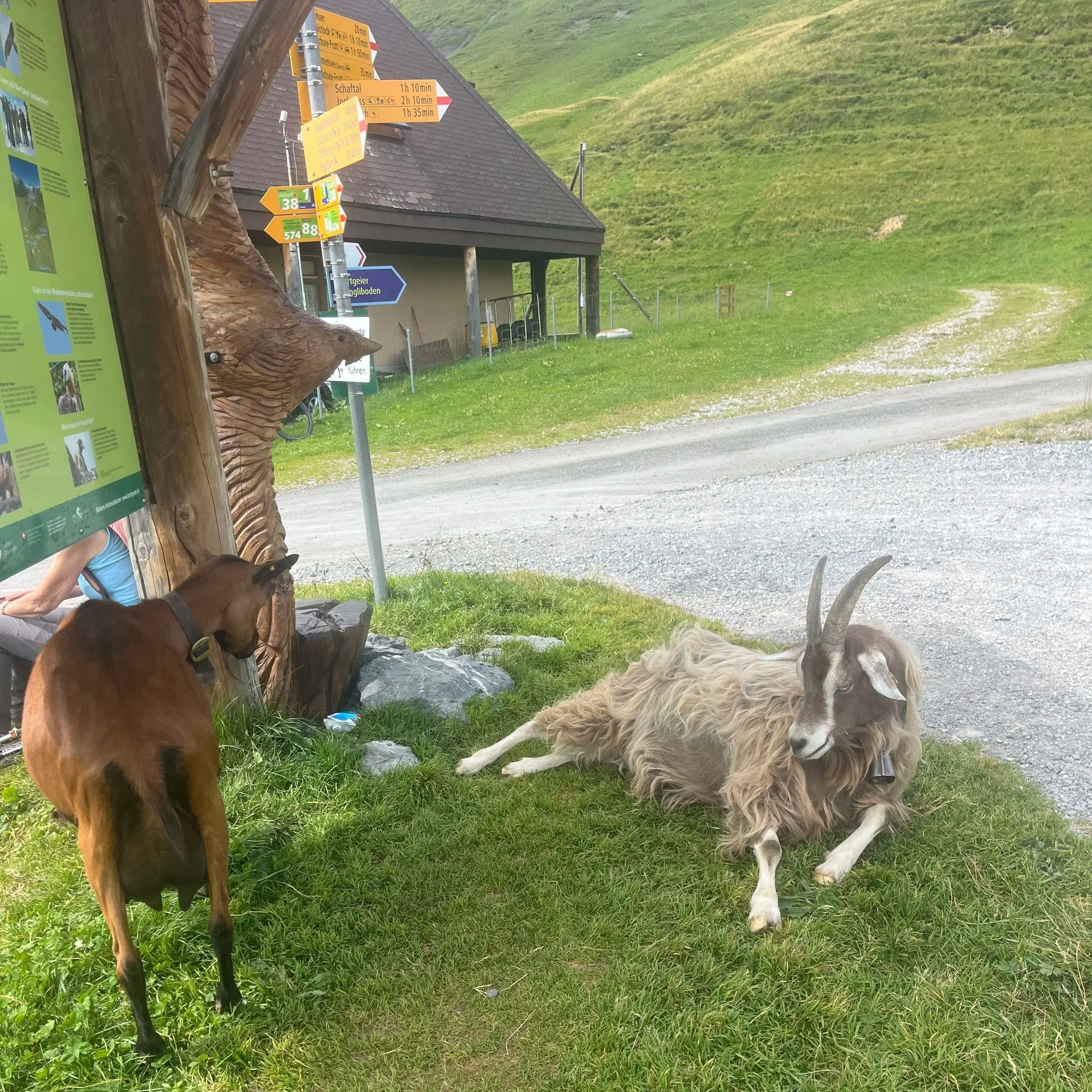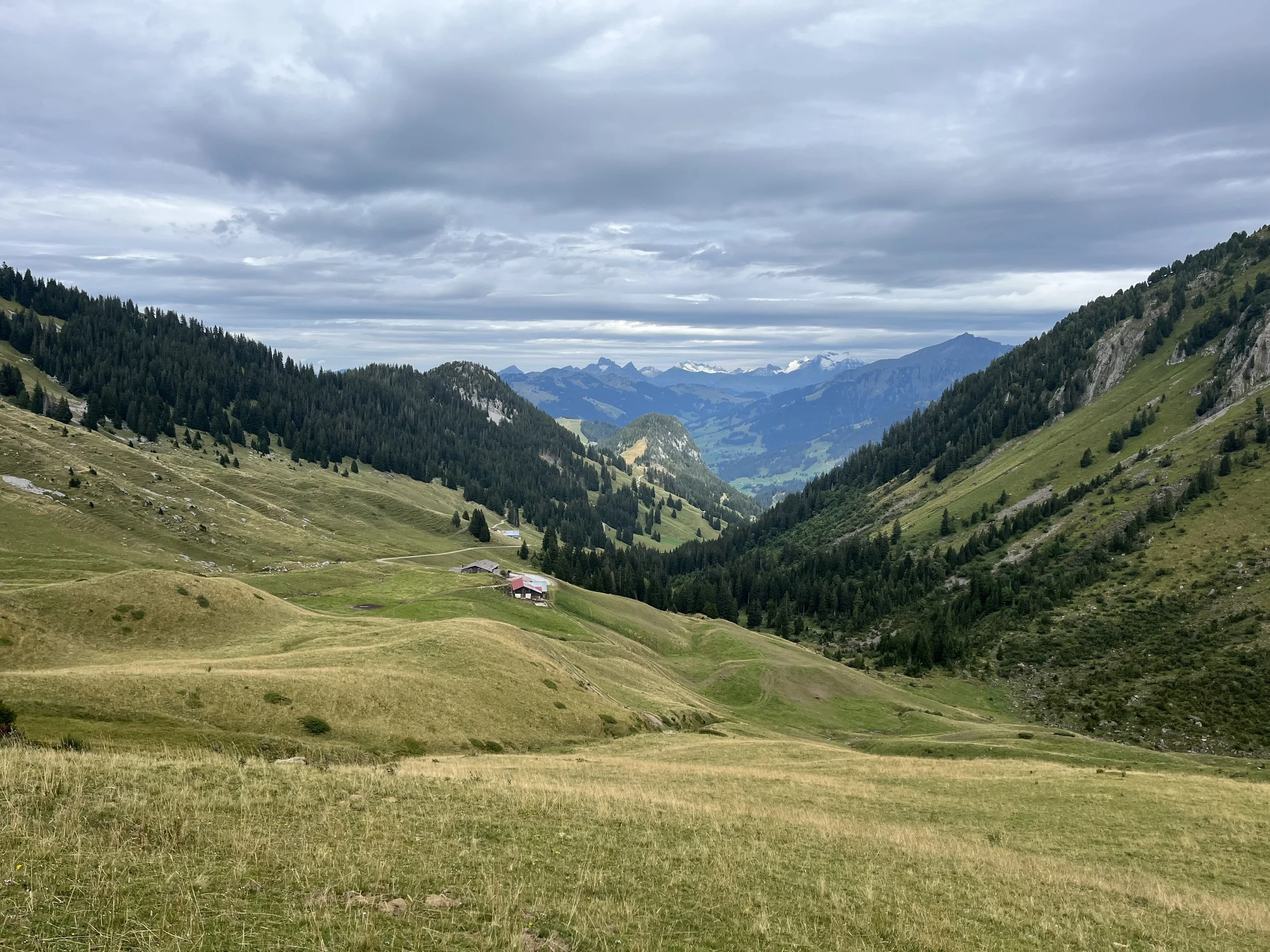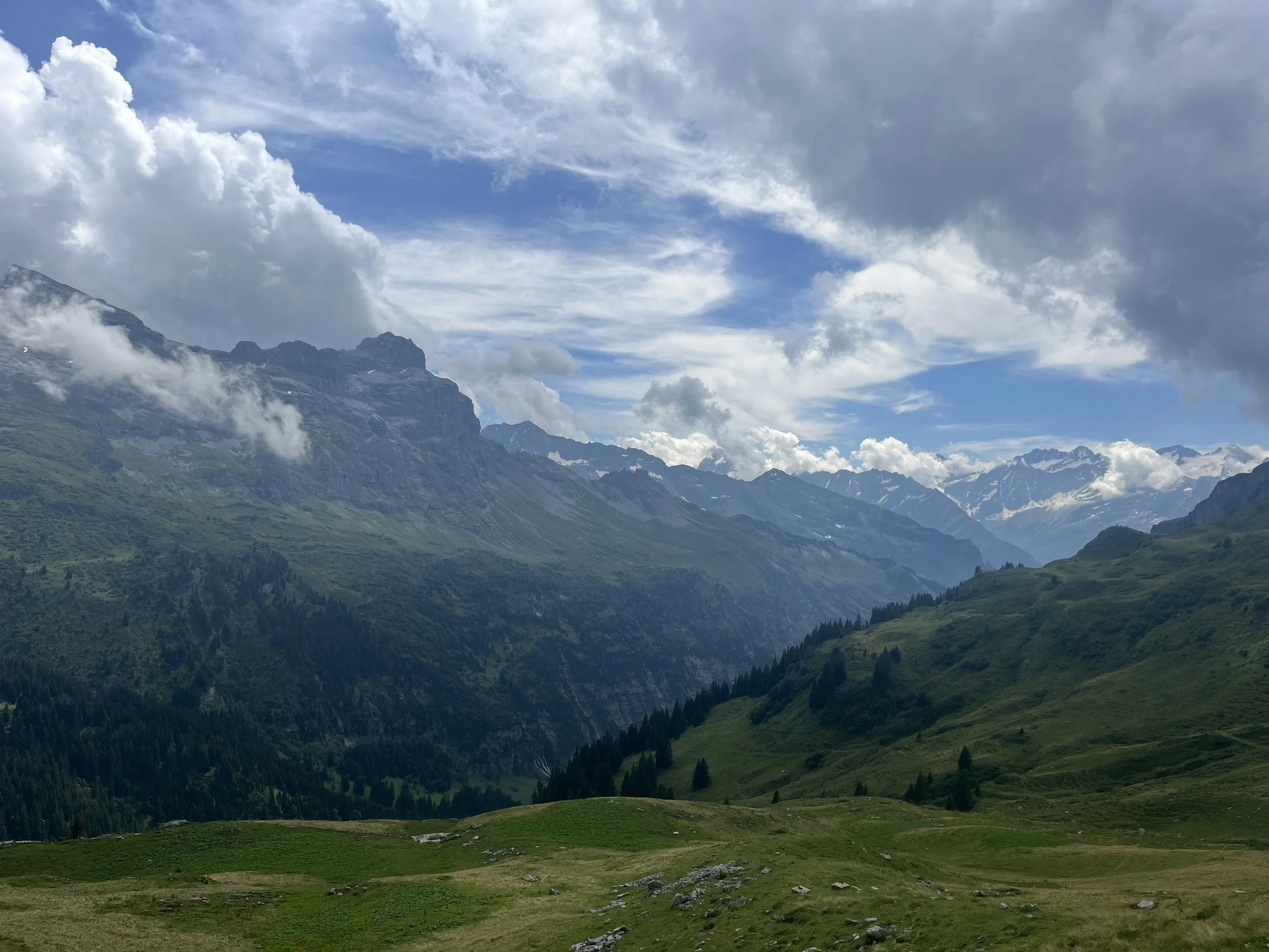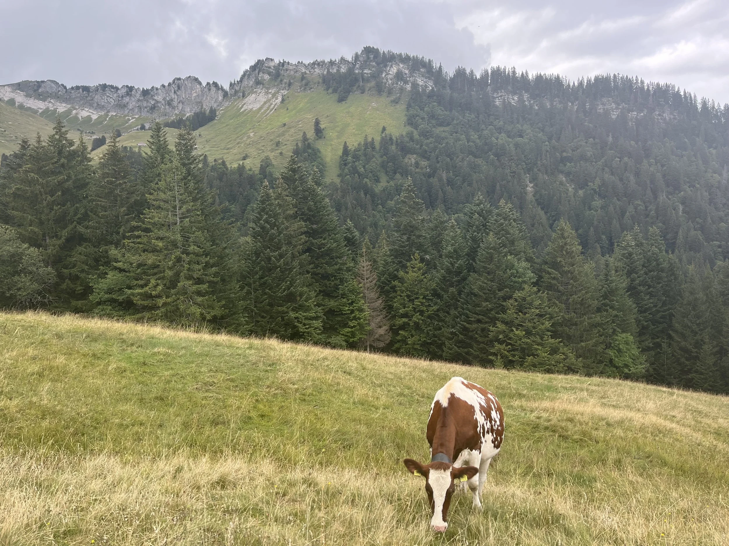 Once I crossed the river, I was greeted by some gentle shade from lush raspberry bushes. The trail then wound through some light woods, including a charming picnic and fire pit. Once through the forest, there was an opening where cows were casually munching in the meadow. Both in the forest and meadow there were some warnings of unstable areas were staying for too long should be avoided. The trail however was very gentle and well-maintained. The cows of this herd were especially friendly and were eager to follow my lead along the trail. I found this very sweet and funny. At the end of the cow pasture, there was the road and the bus stop for Obererbs, Skihütte. There was a cute little hut there that served nice little cakes and drinks. I throughly enjoyed my “rüeblitorte” and my conversation with the waitress. She was very kind and inquired about my travel plans. After a delightful break, I ventured up through the blueberry bushes and gentle grassy hillside towards the first outlook over Richetlipass.