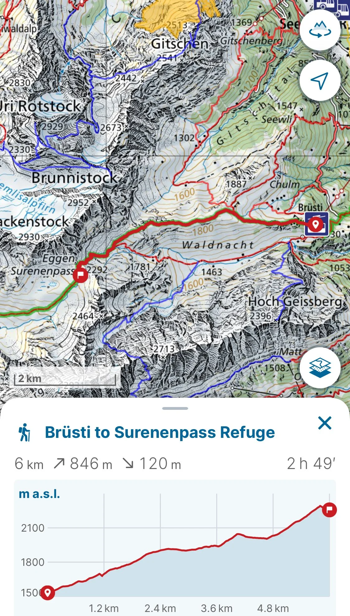 Good to Know: Short cut from Unterschächen via bus 408 from Unterschächen to Attinghausen Seilbahn and then taking the gondola at Attinghausen Seilbahn to Brüstli. There are restaurants and water fountains available at Brüstli. This is the last place for water before the farm during the descent to Engelberg (which was the next day for me)!