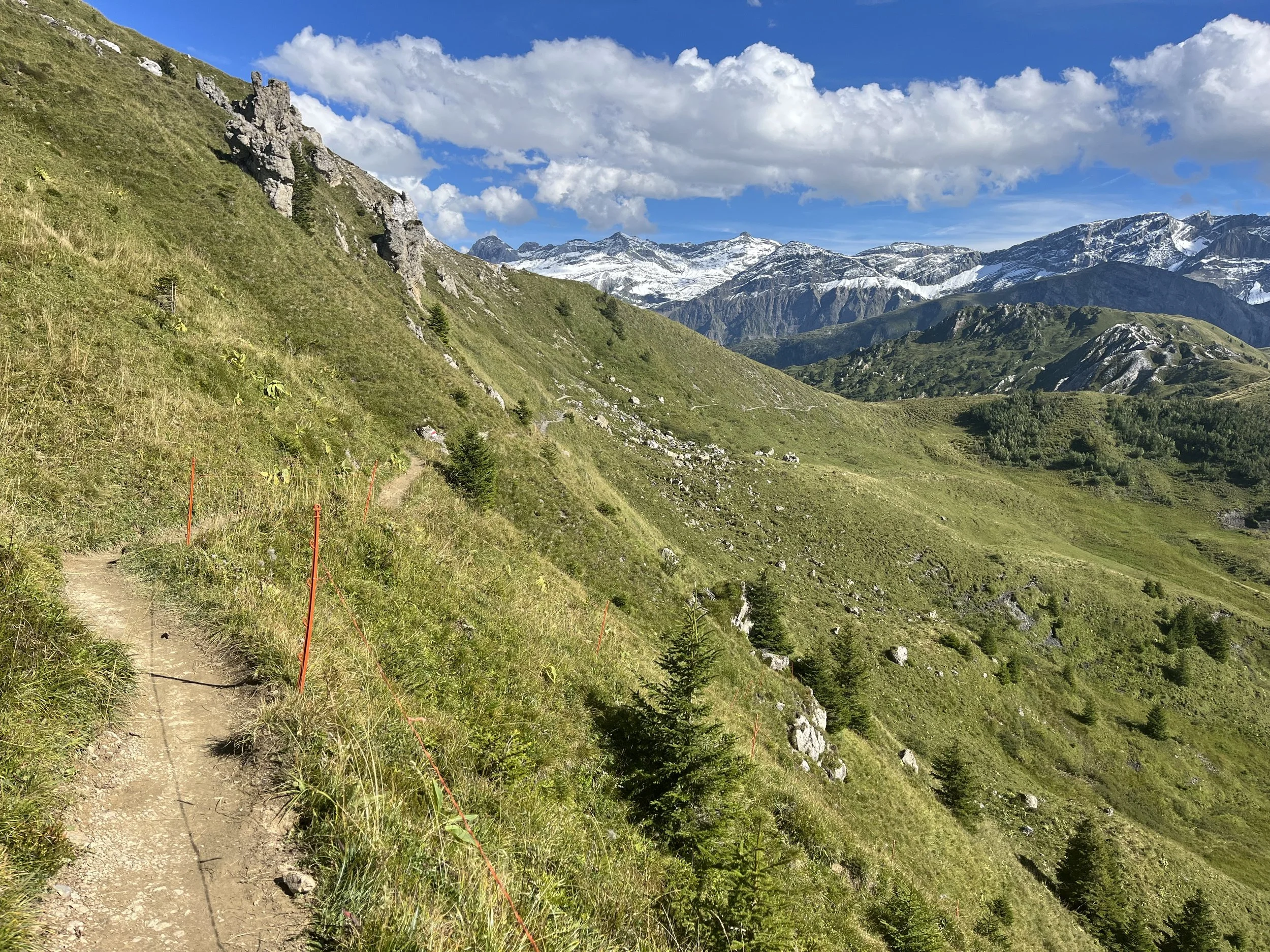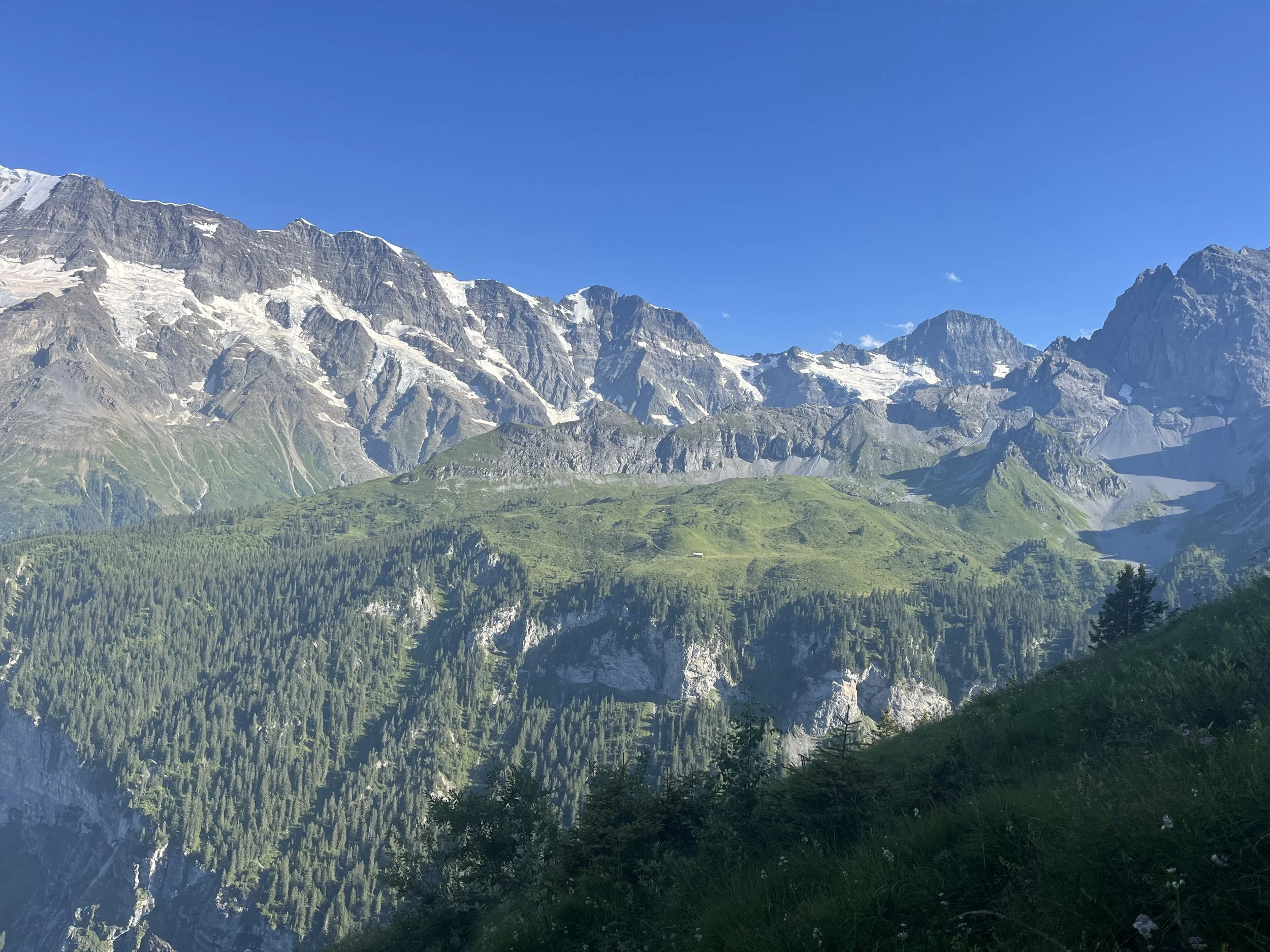 The forest was super majestic and peaceful. Eventually the forest opened up into an alpine meadow with gorgeous views (also the image at the top of the article). You could see all the way to Glacier 3000.
